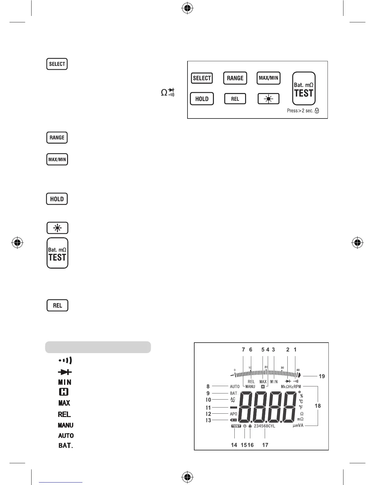 Kiedy obrotowy przełącznik jest w położeniu Bat.mΩ, naciśnięcie tego przycisku (dalej określanego jako