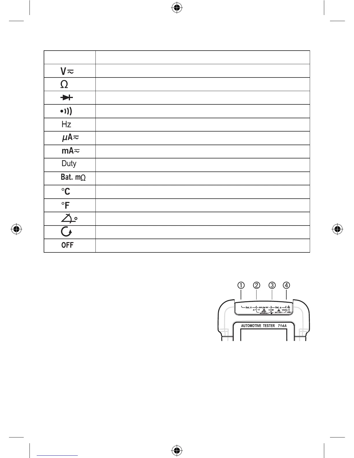 ➂Negativ indgangsklemme for termoelement af type K til temperaturmålinger. Indgangsklemme for prøvestrøm ved