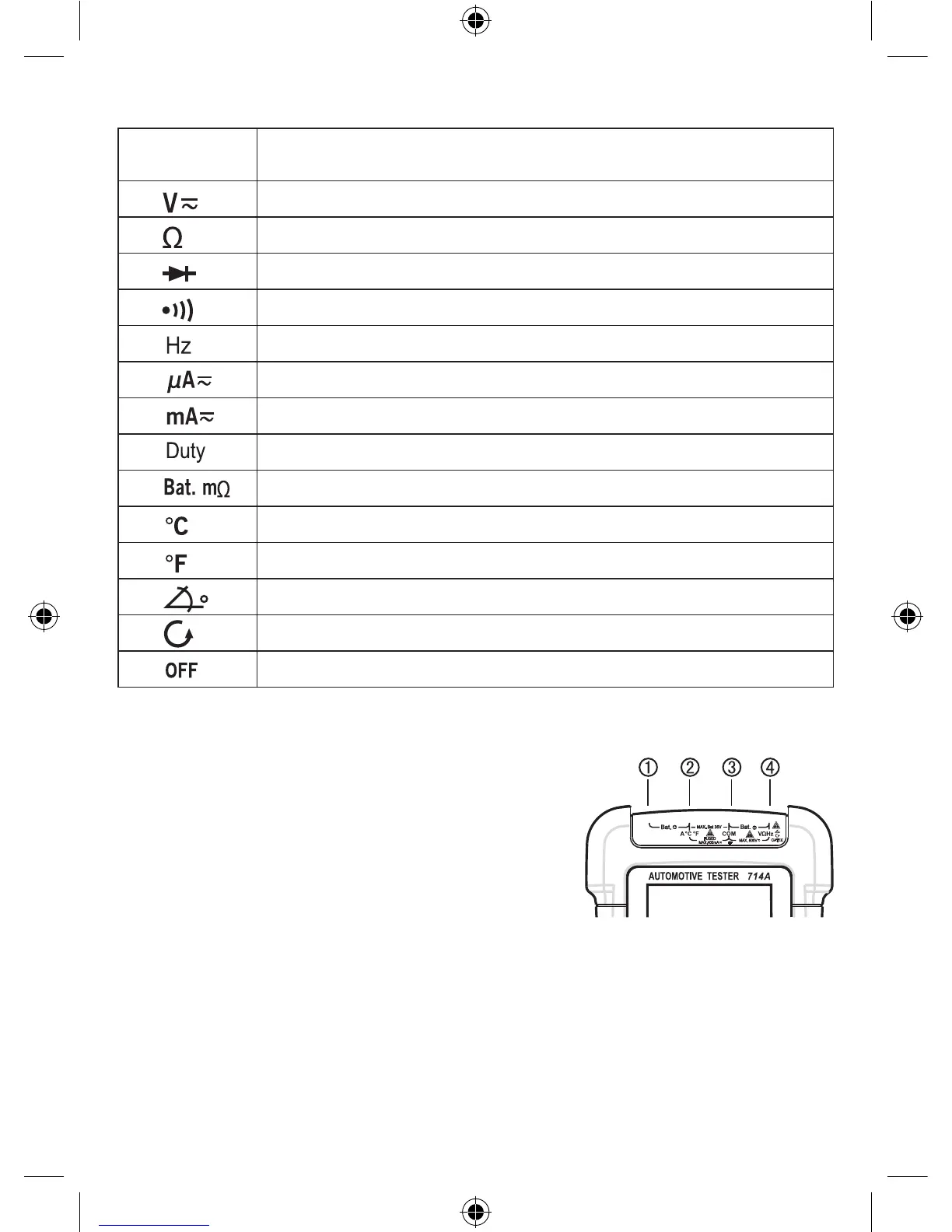 ➃Terminaldeentradaparalasmedicionesdetensión,continuidad,resistencia,diodo,frecuencia,RPMyleva.Terminaldeentrada
