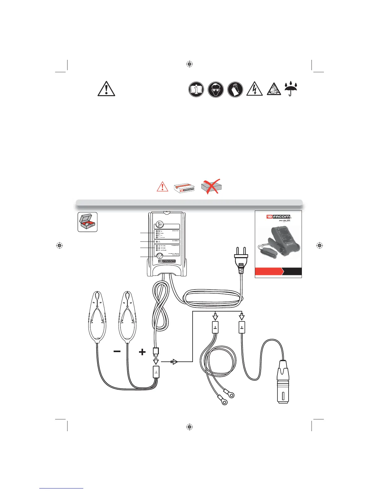 - FACOM og dennes autoriserede reparatører er de eneste, som må udføre reparationer på opladeren, og der må kun