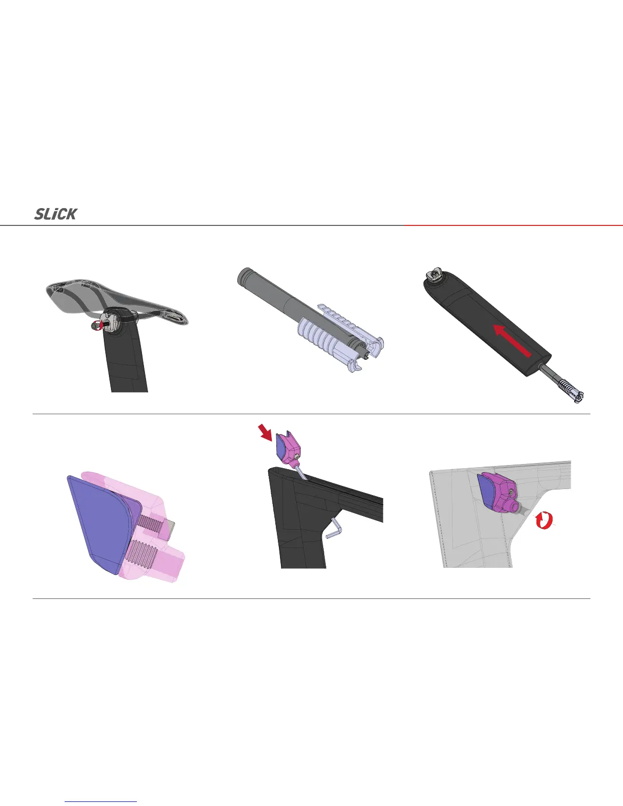 Slide 4 mm hex wrench through the hole under the top tube and use to guide the seat post wedge into position