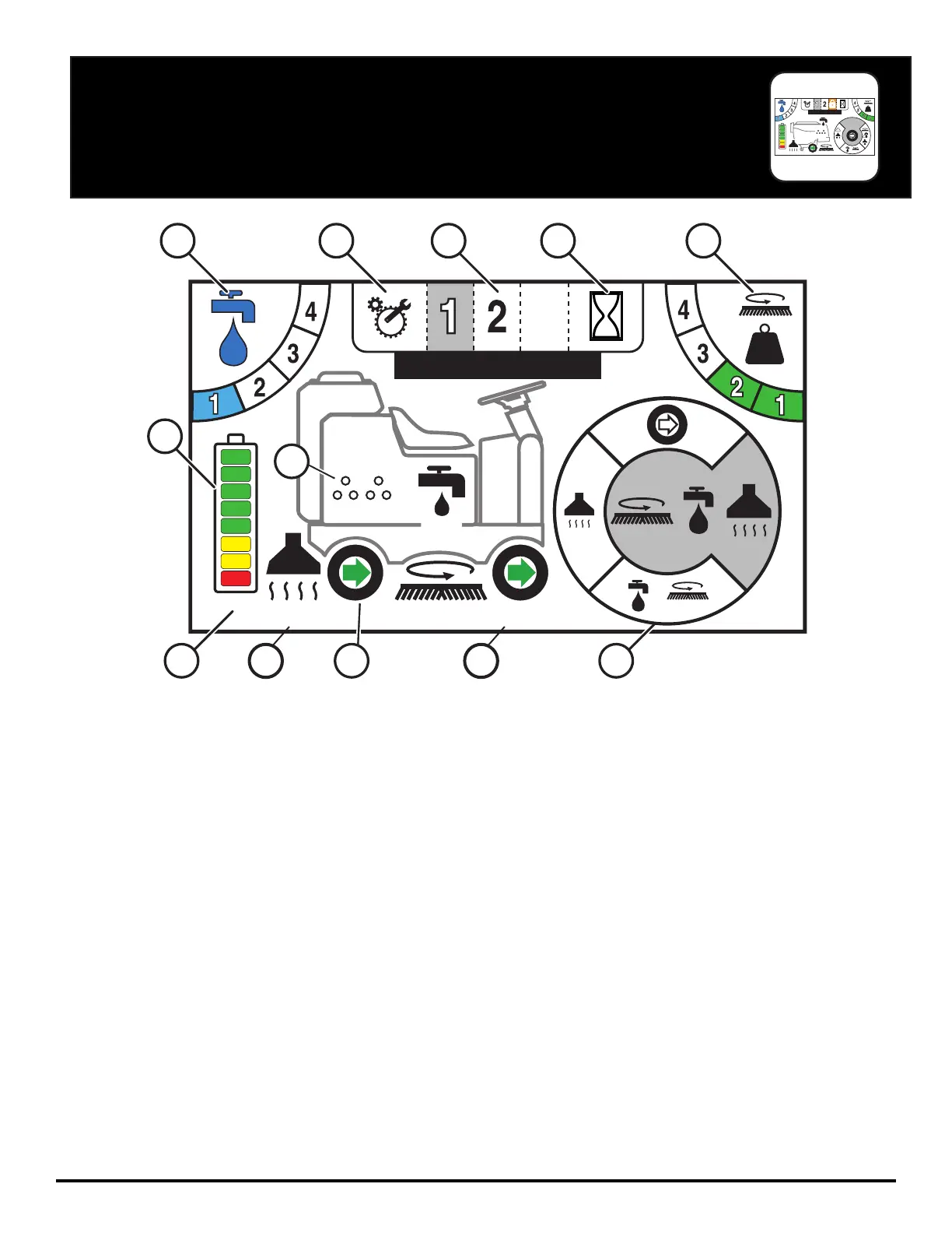 4. HOUR METERS - Displays all of the hour meters of the machine: Key Switch, Transport, Scrub Motors, and Vacuum Motor