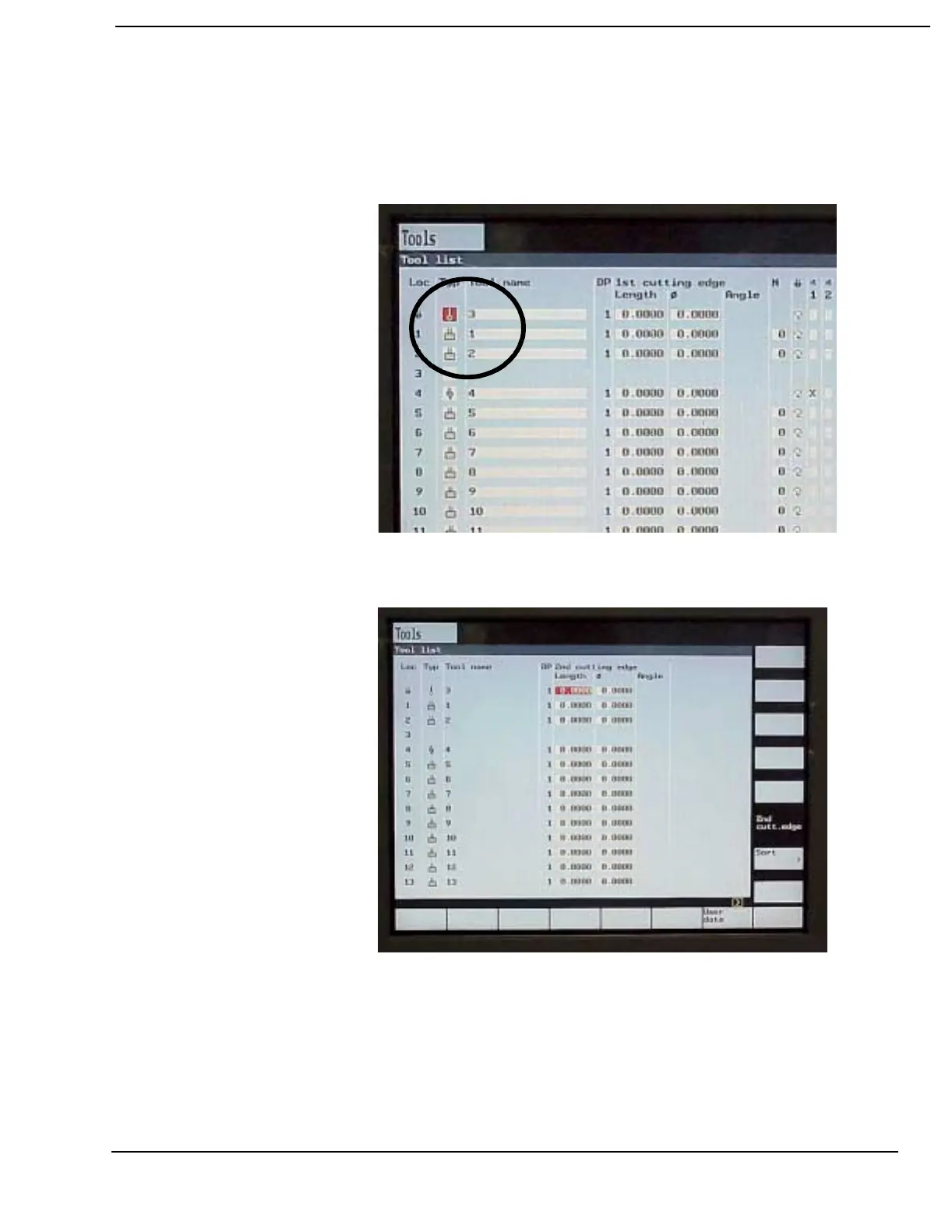 Use the 2nd cutt. edge soft key to toggle between the displays. The CNC