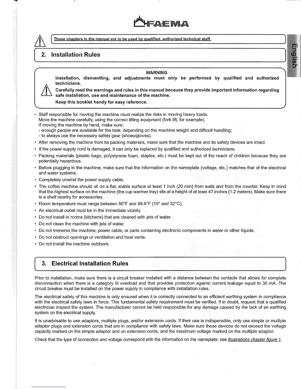Faema Carisma - 2. Installation Rules; 3. Electrical Installation Rules