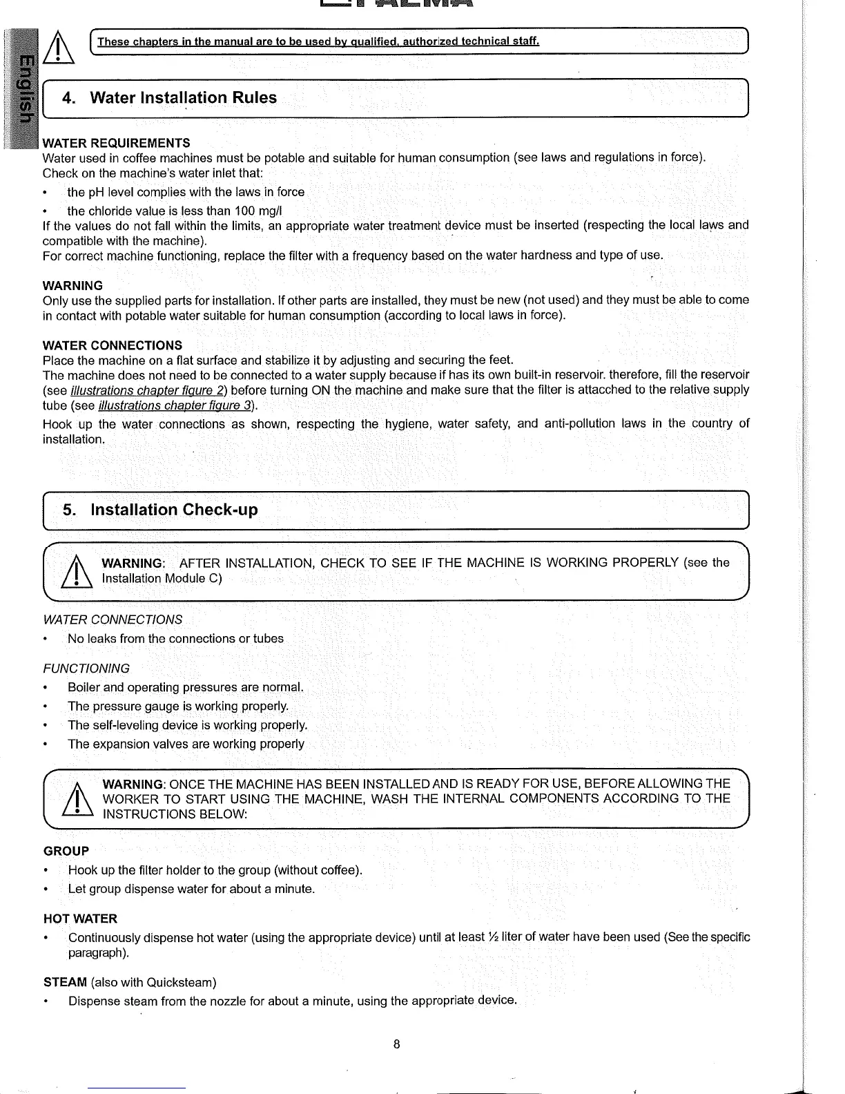 Faema Carisma - 4. Water Installation Rules; 5. Installation Check-up