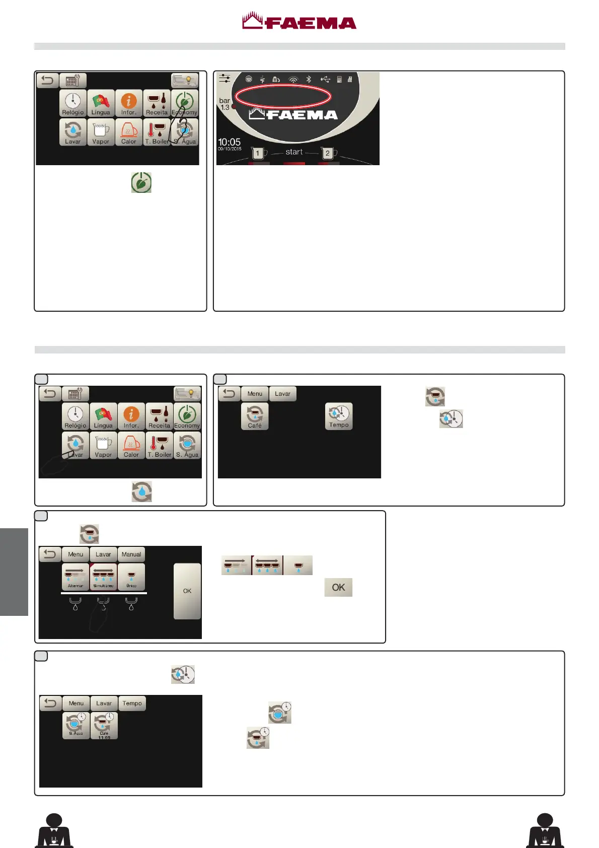 de mudança da água da caldeira e de lavagem do circuito do café.