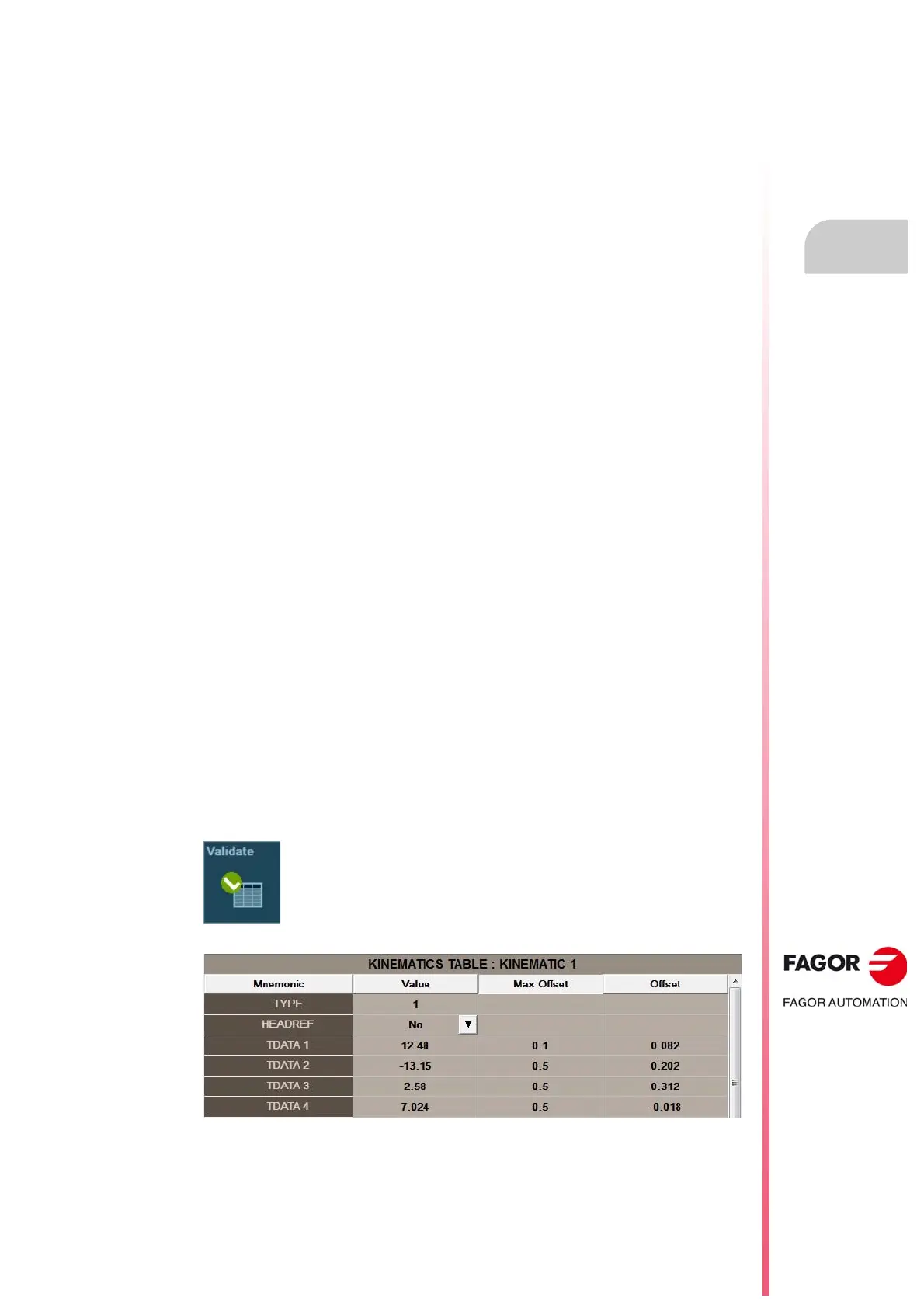 This page shows, for each TDATA parameter of the kinematics, the values and offsets