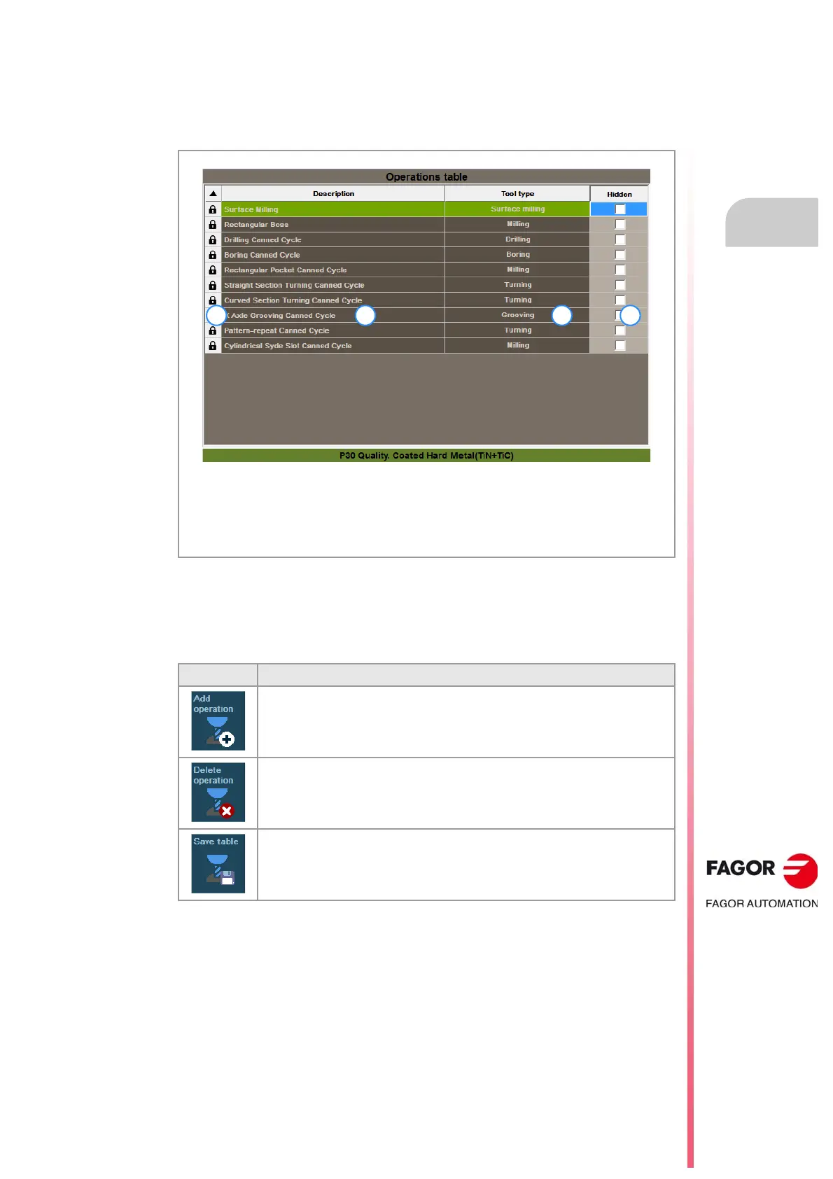This table lists the operations defined by Fagor, the OEM and the user. The OEM and the