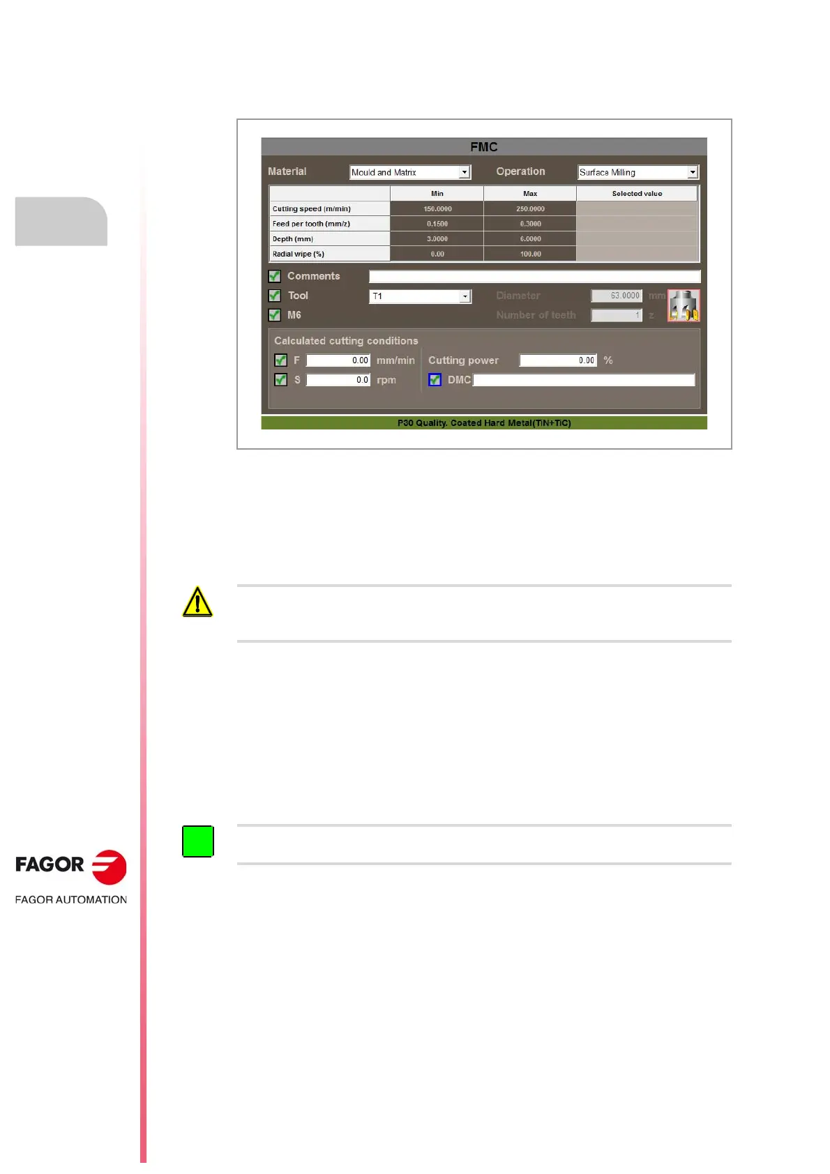 3 The FMC calculates the optimal cutting conditions (F and S) for the chosen material,