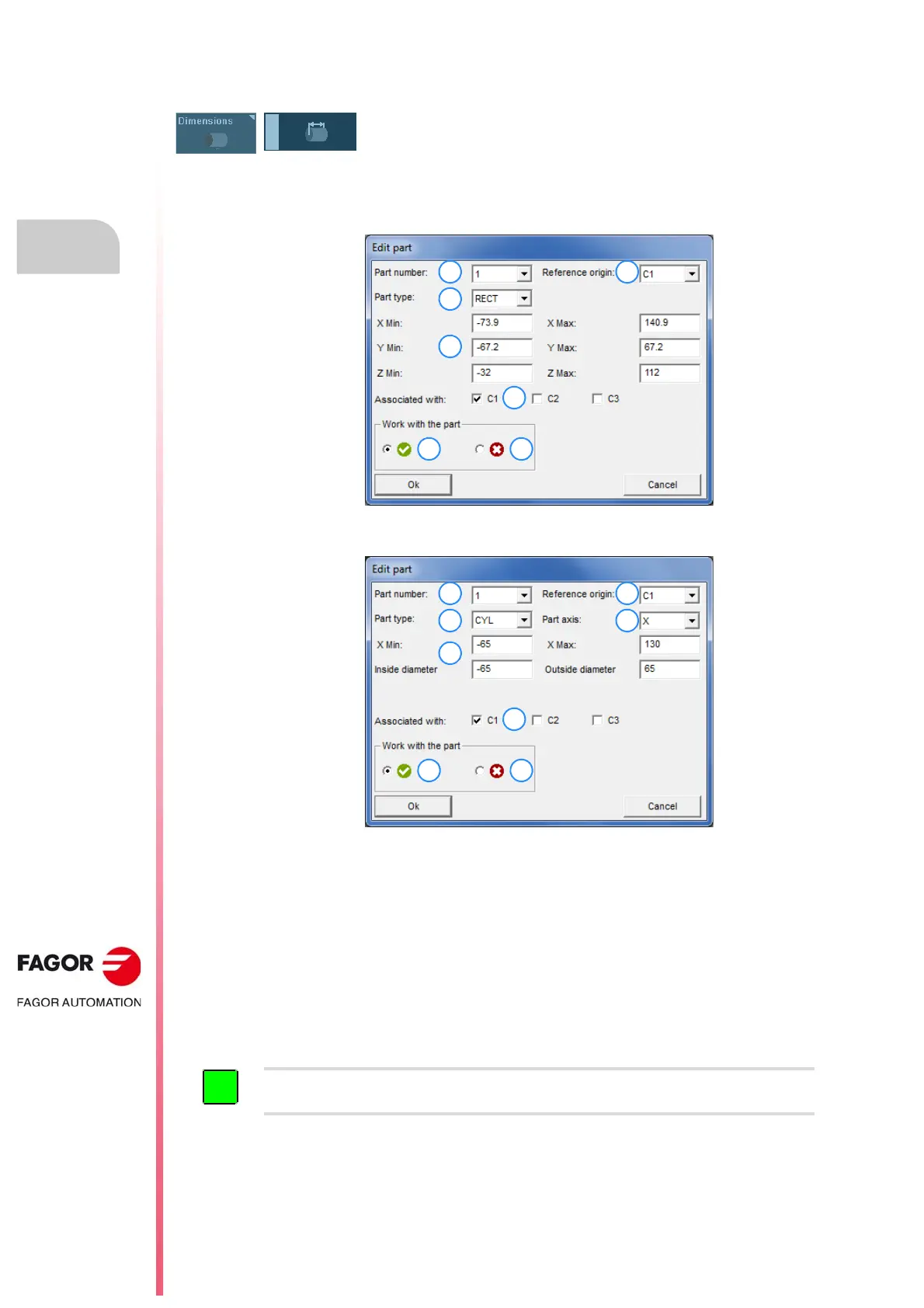 The dimensions of the part correspond to the part zero (G92, G54 to G59, G159) active at the time