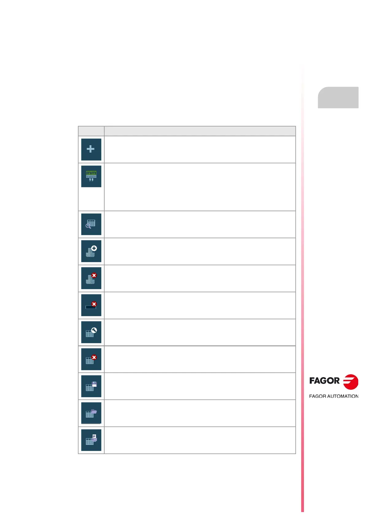 Remove a tool from the list. A tool cannot be deleted if it is in the tool magazine. This icon
