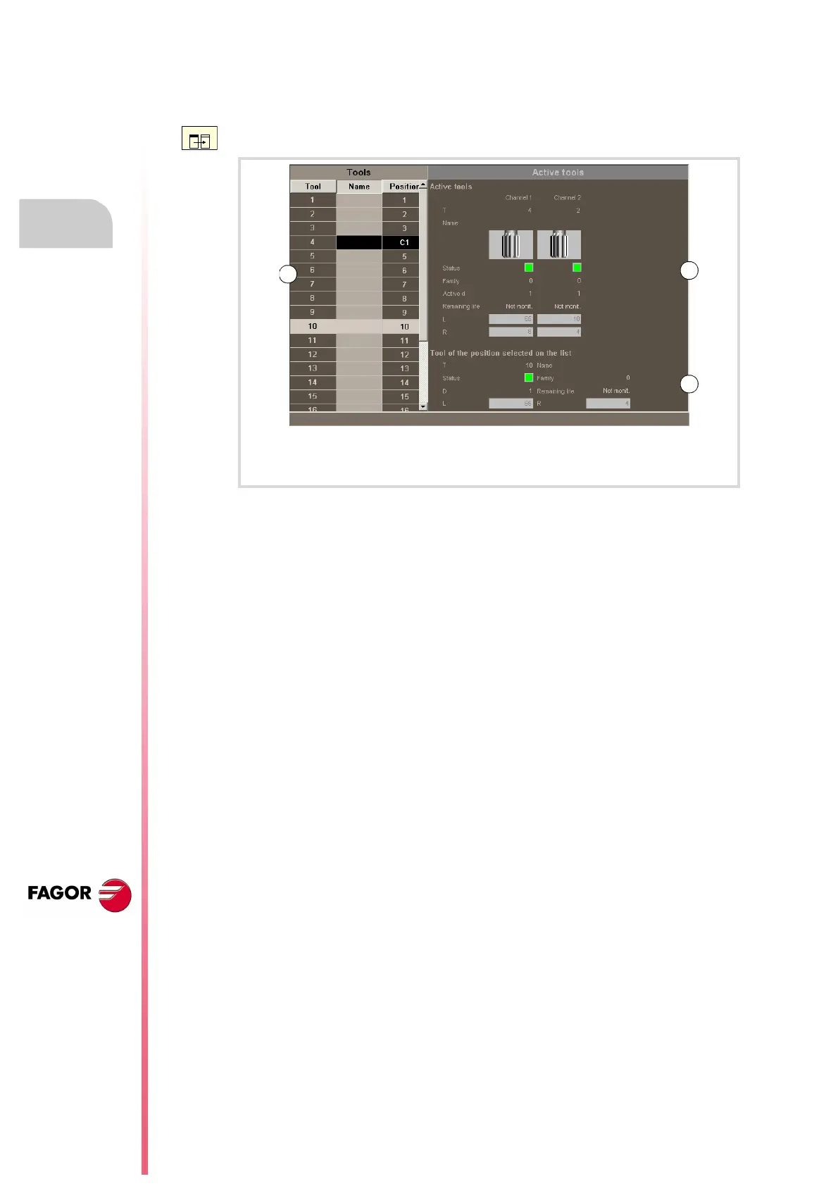 ground tool or the tool is active in a channel. The CNC updates data of the list every time