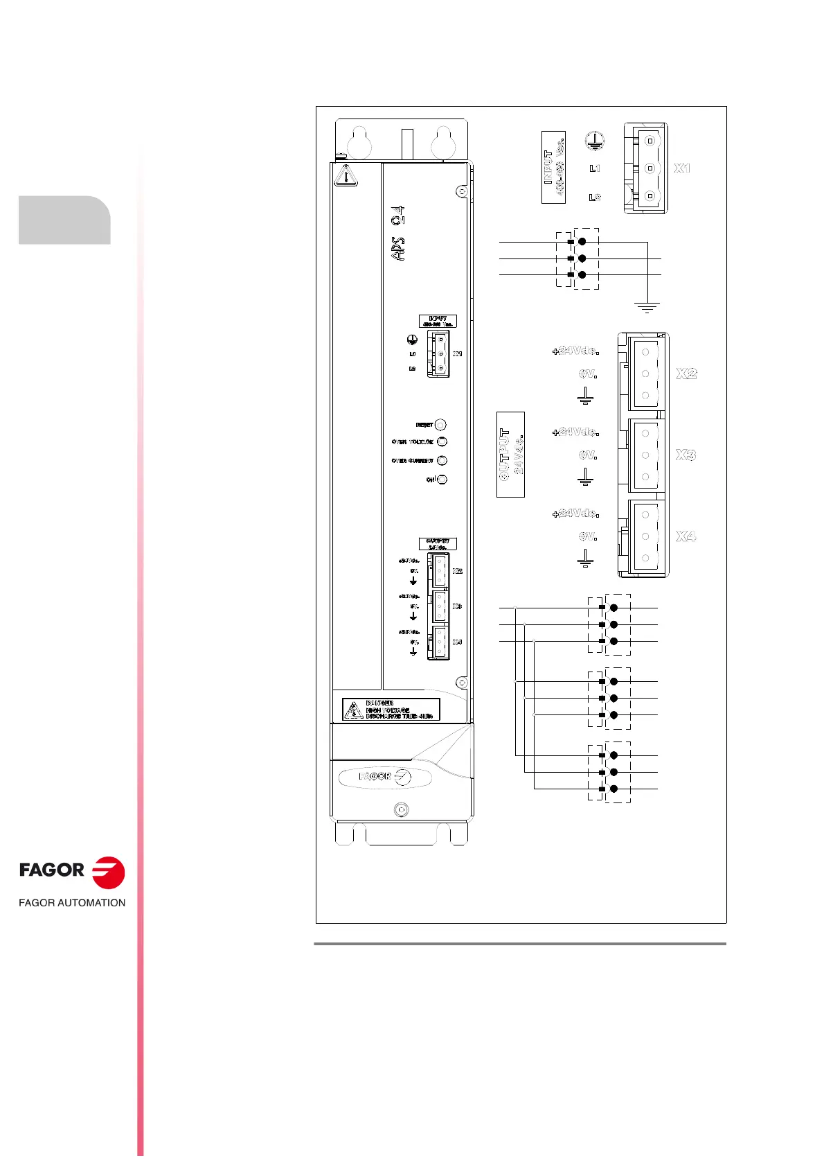X2. Output connector of the auxiliary power supply offering 24 V DC.