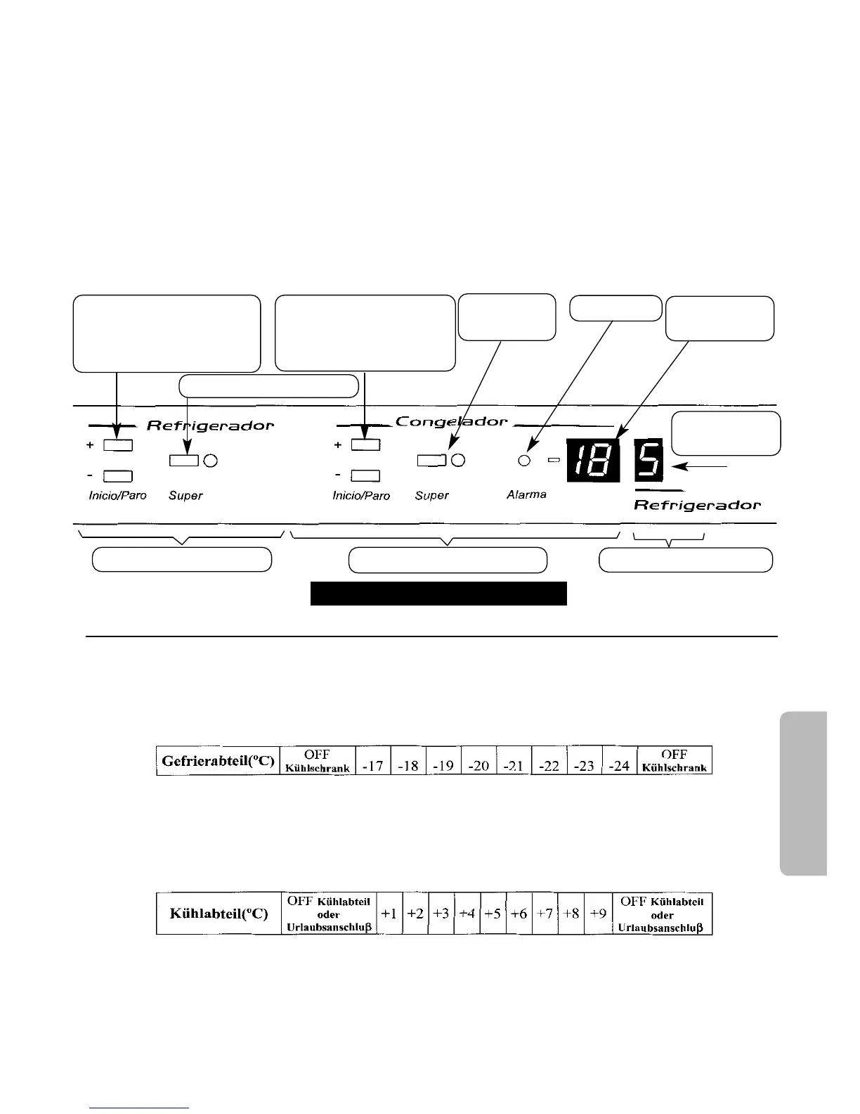 Tasten + oder – wiederholt betätigt werden, bis das Display des Kühlabteils ausschaltet. Lassen Sie