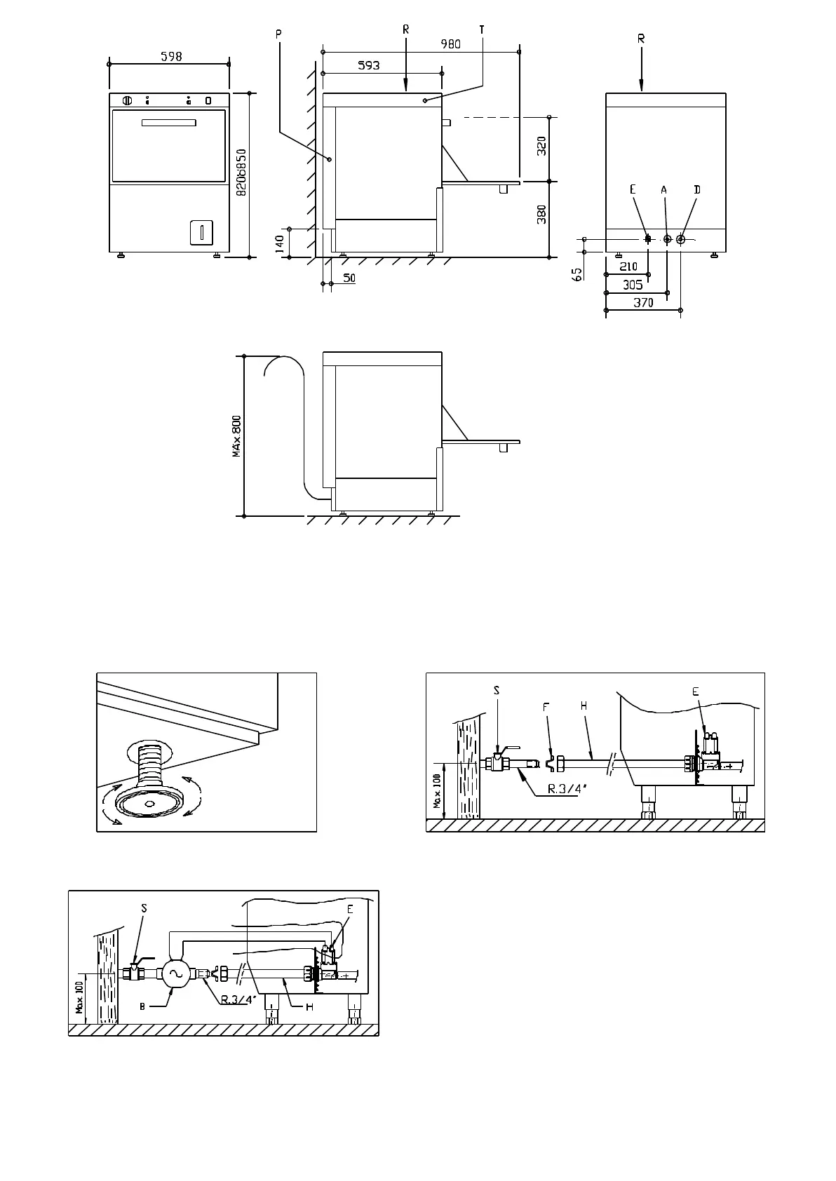 A=Toma de agua D=Manguera Desagüe E=Manguera eléctrica R=Regleta conexión