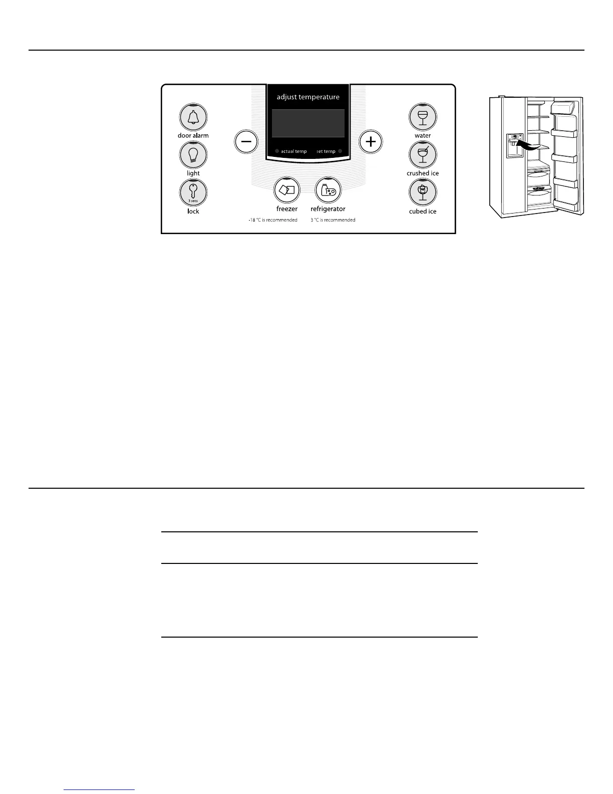 To adjust the set point temperature, press the "+" (warmer) or "-" (colder) button on either the Freezer or