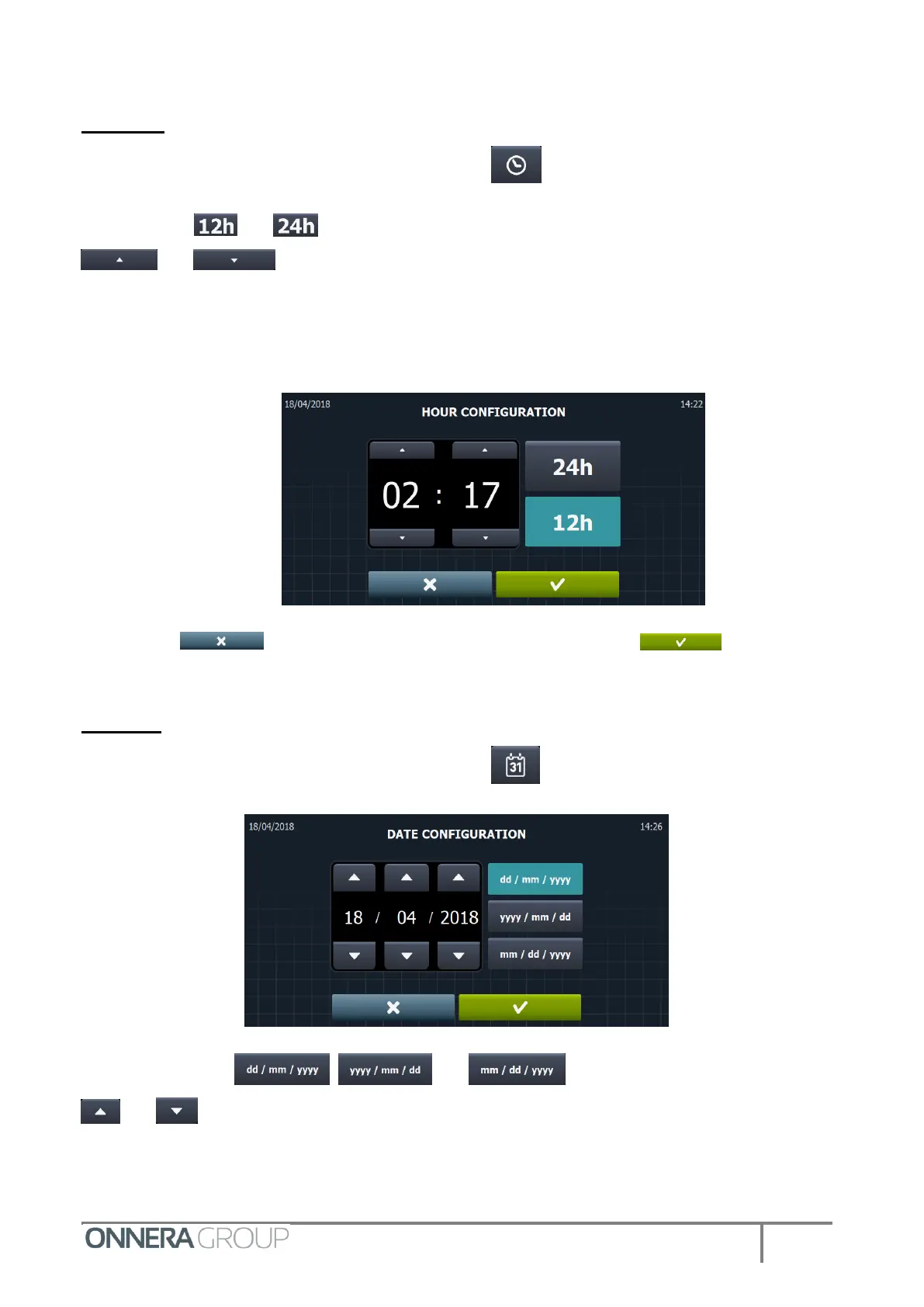 On the initial configuration screen select the icon , and go to the adjust date menu.