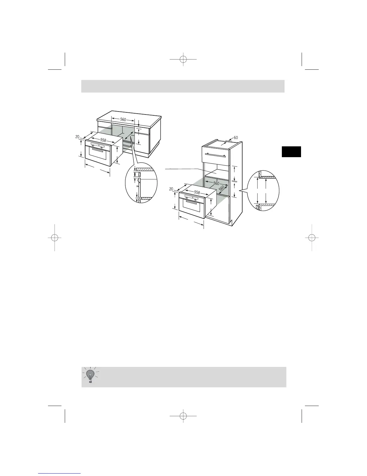 50 mm in de achterwand van de inbouwruimte om de voedingskabel door te trekken (Zie