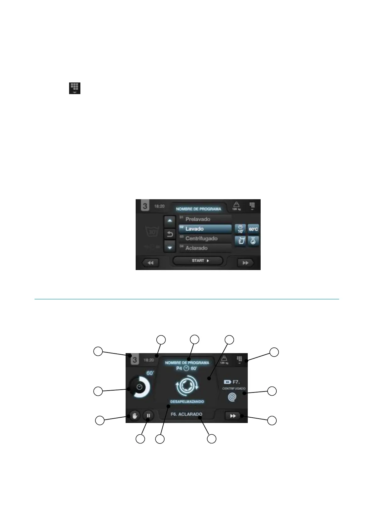 4. Main menu: Access to washing machine main menu, where the different machine