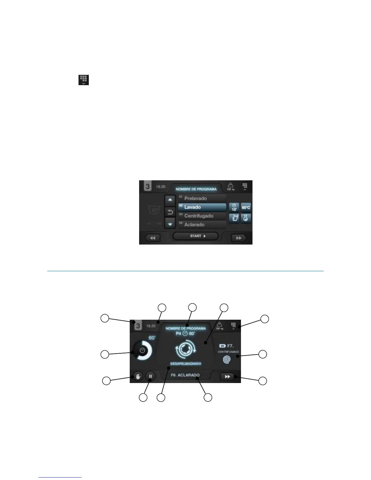 4. Main menu: Access to washing machine main menu, where the different machine