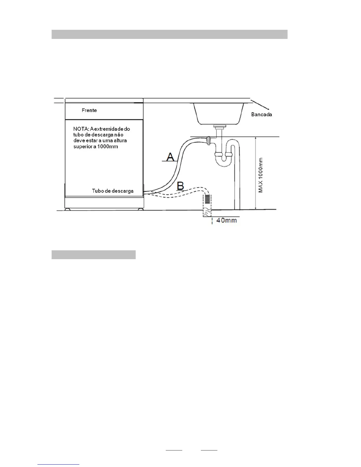 tubo de descarga deve estar a uma altura de entre 40 cm e 100 cm. A parte final do tubo não deve submergir em água,
