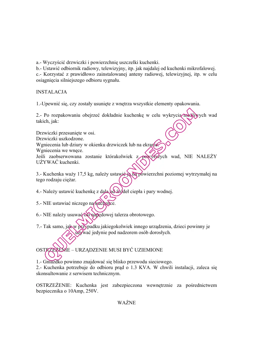 2.- Kuchenka potrzebuje do odbioru prąd o 1.3 KVA. W chwili instalacji, zaleca się