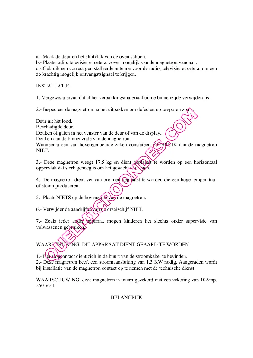 WAARSCHUWING: deze magnetron is intern gezekerd met een zekering van 10Amp,