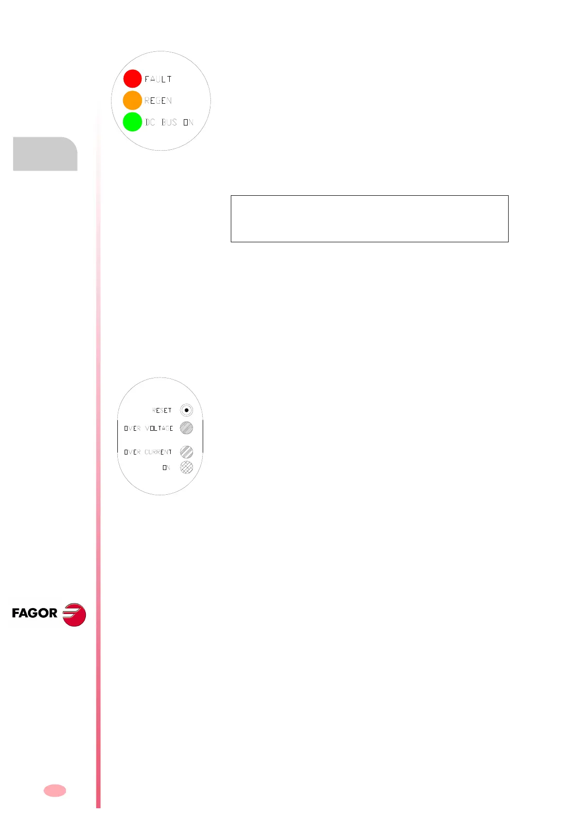 FAULT turned ON. Red LED on all the time. It indicates that there is an