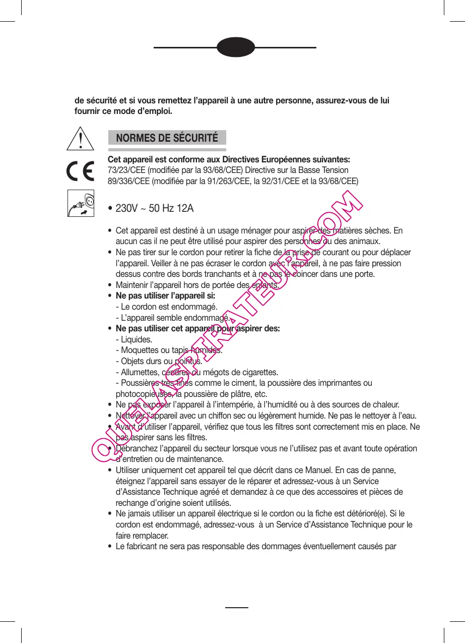 • Cet appareil est destiné à un usage ménager pour aspirer des matières sèches. En