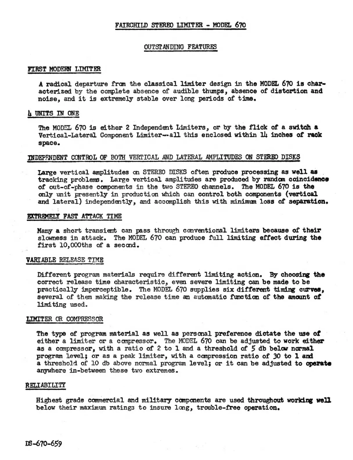 Fairchild 670 - Outstanding Features; First Modern Limiter Design; Independent Vertical and Lateral Amplitude Control; Extremely Fast Attack Time