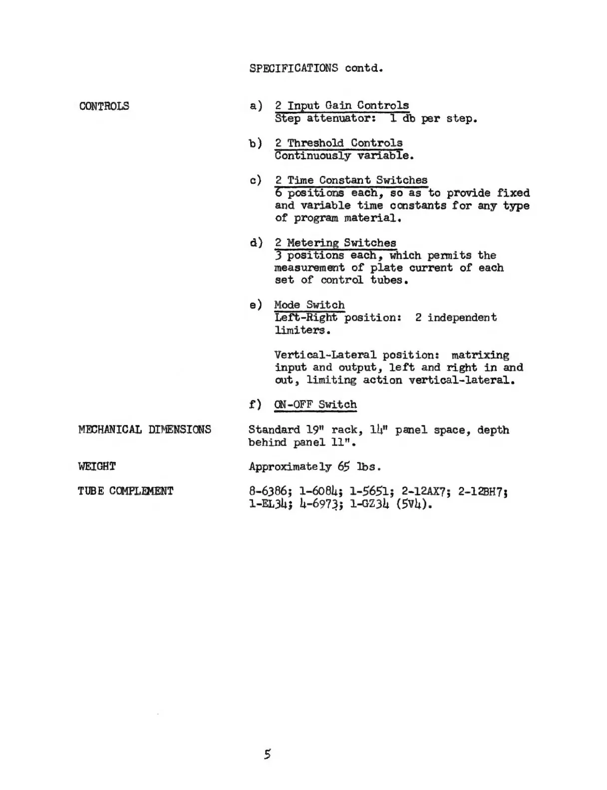 Fairchild 670 - Specifications - Controls and Physical; Control Functions Overview