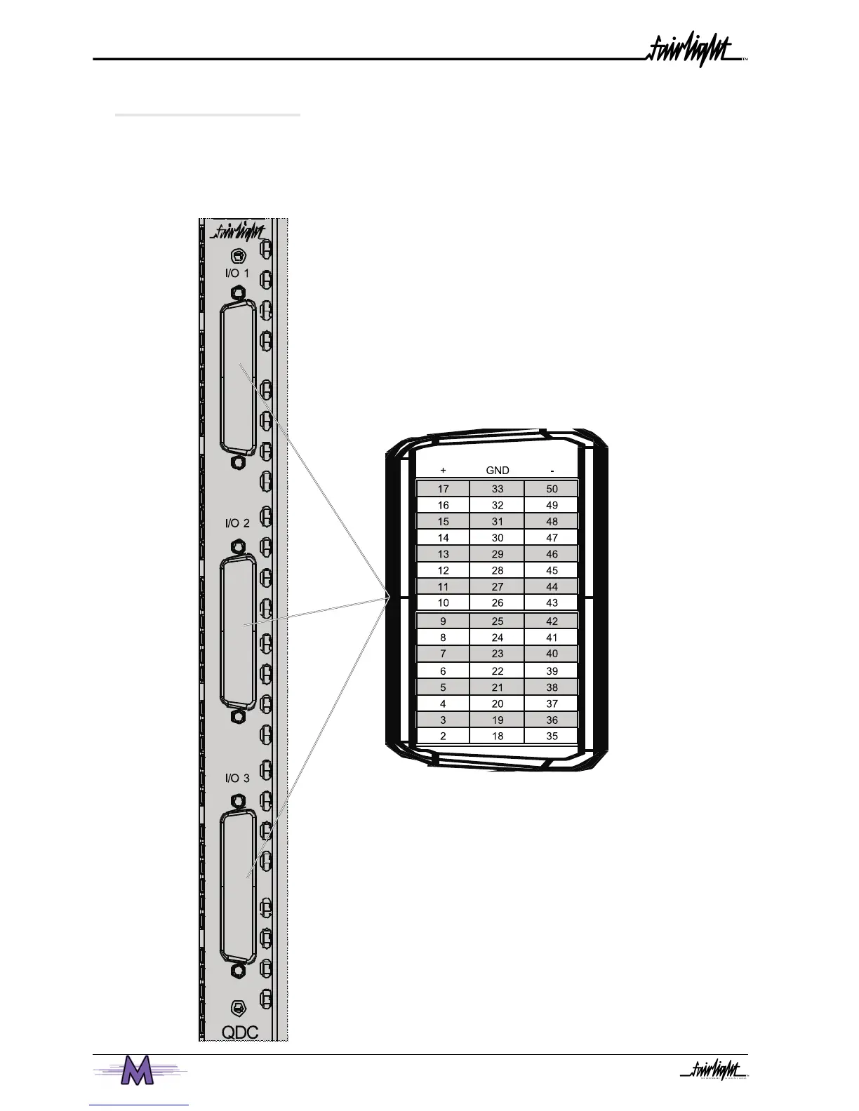 Each QDC card comes with three connectors, each housing 50 pins. The following