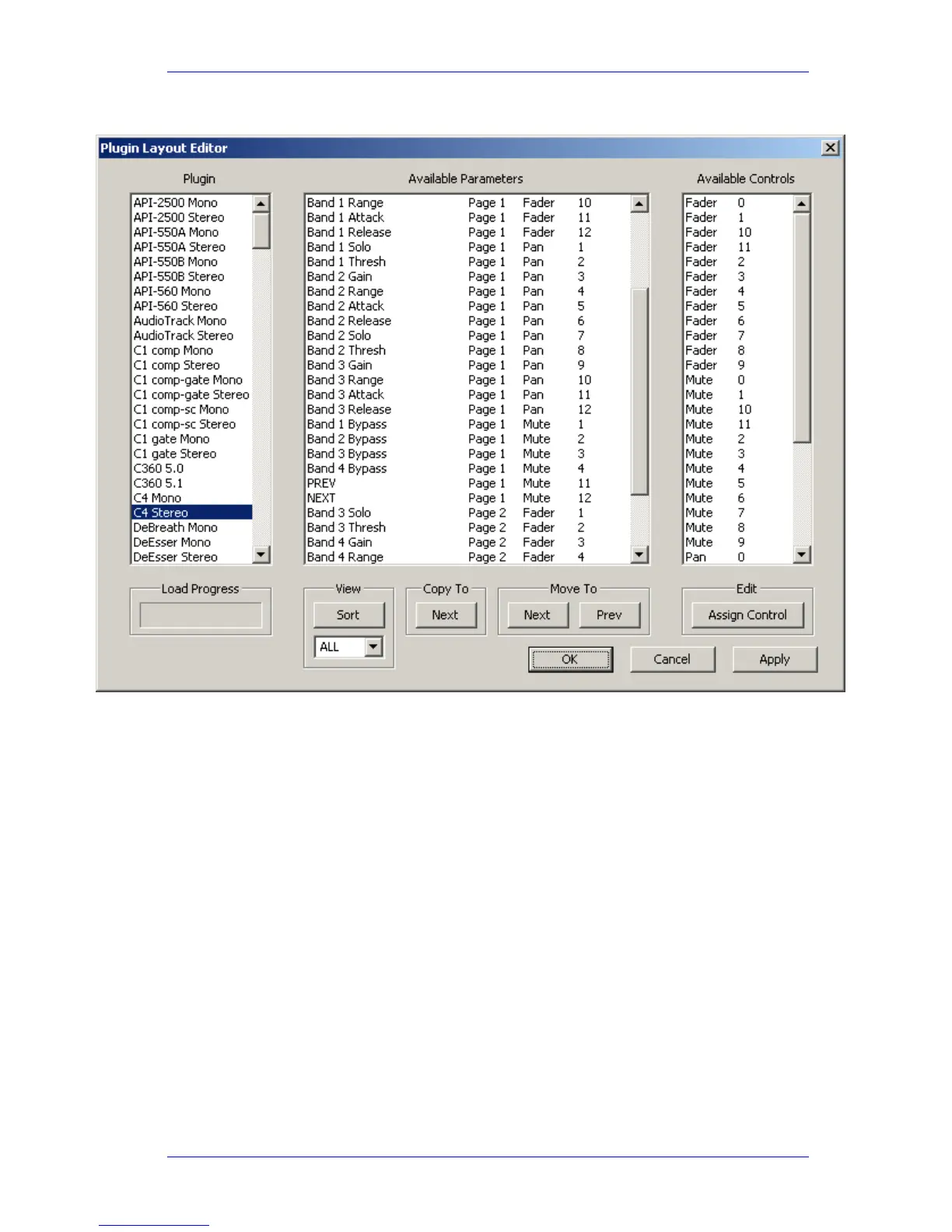 For each parameter, the dialog box shows which page of plug-ins it has been assigned, and which