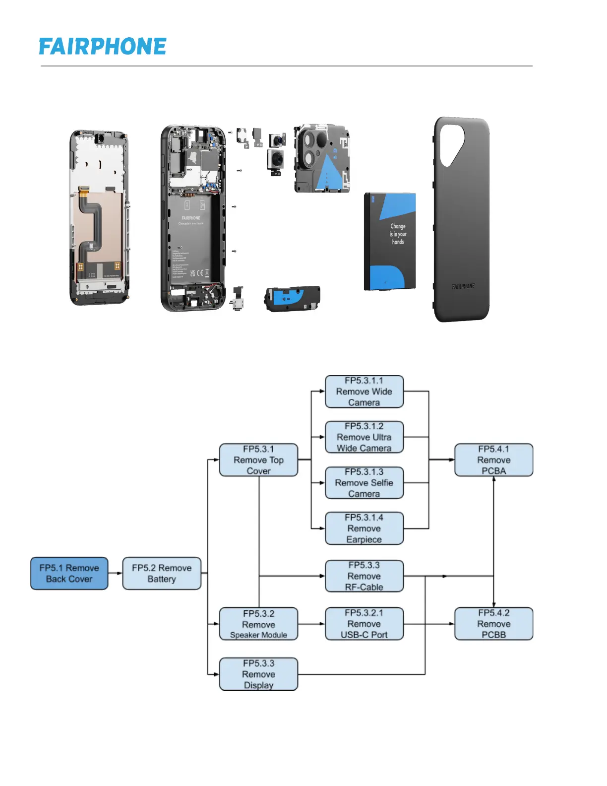 Fairphone 5 - a. Spare parts overview and disassembly map; b. Disassembly Flow