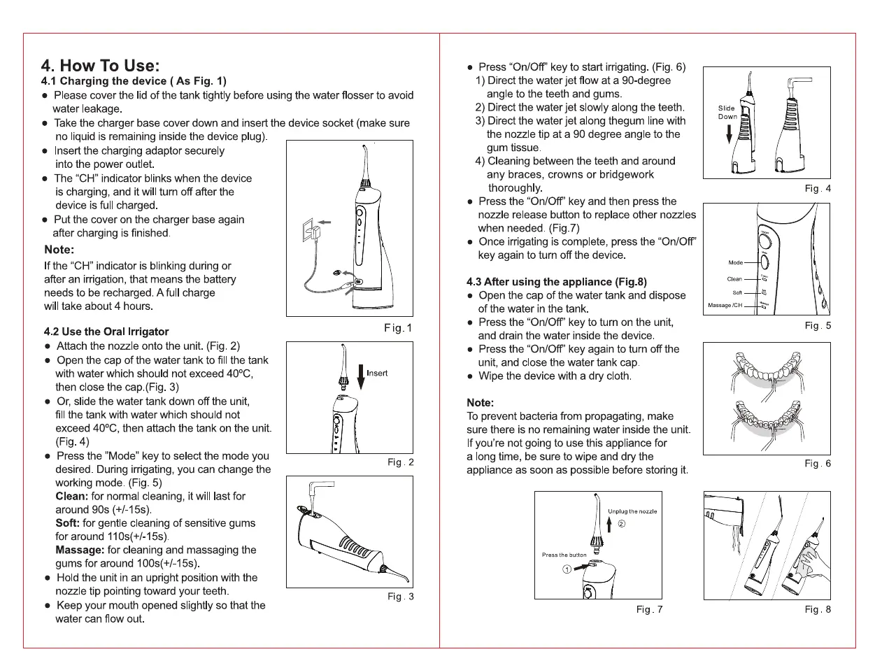 Fairywill E11 - How To Use; Charging the device; Use the Oral Irrigator; After using the appliance