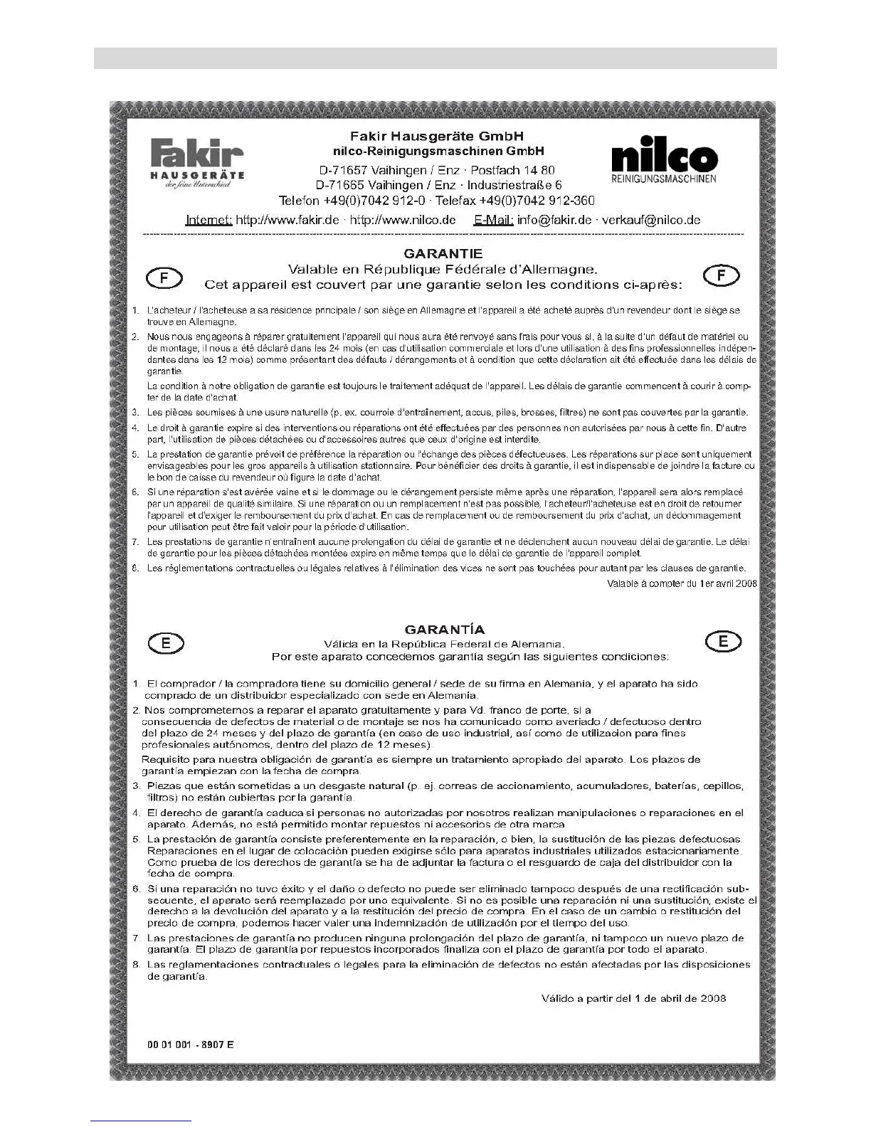 Fakir NT 21 - Garantieerklärung F, E