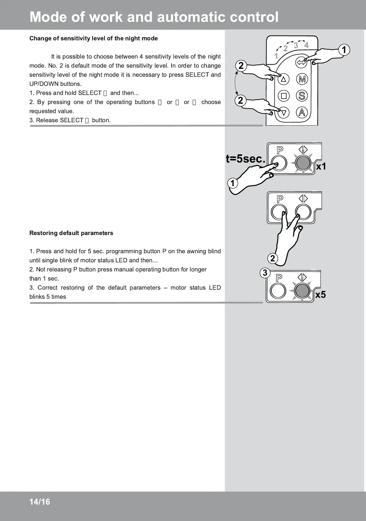 1 . Press and hold for 5 sec. programming button P on the awning blind