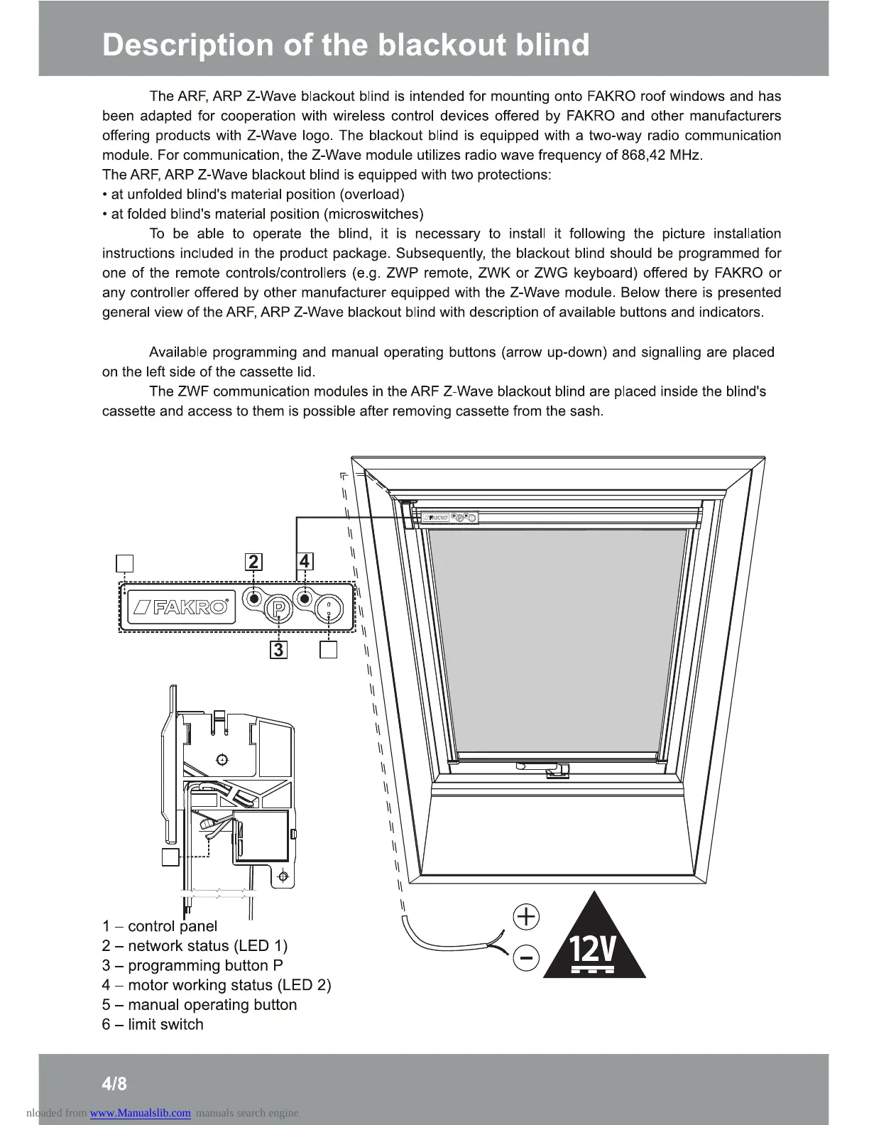 general view of the ARF, ARP Z-Wave blackout blind with description of available buttons and indicators.