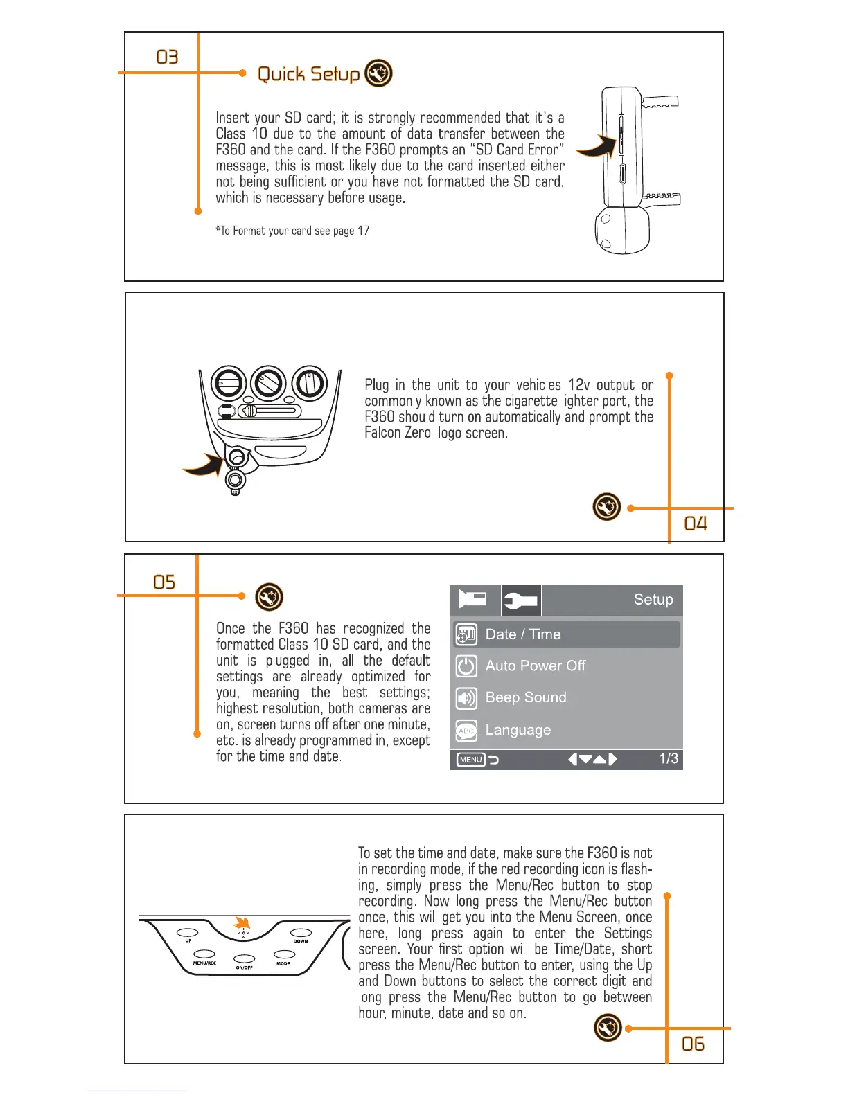 Falcon Zero F360 - Quick Setup; SD Card Insertion; Power Connection and Auto-On; Setting Time and Date