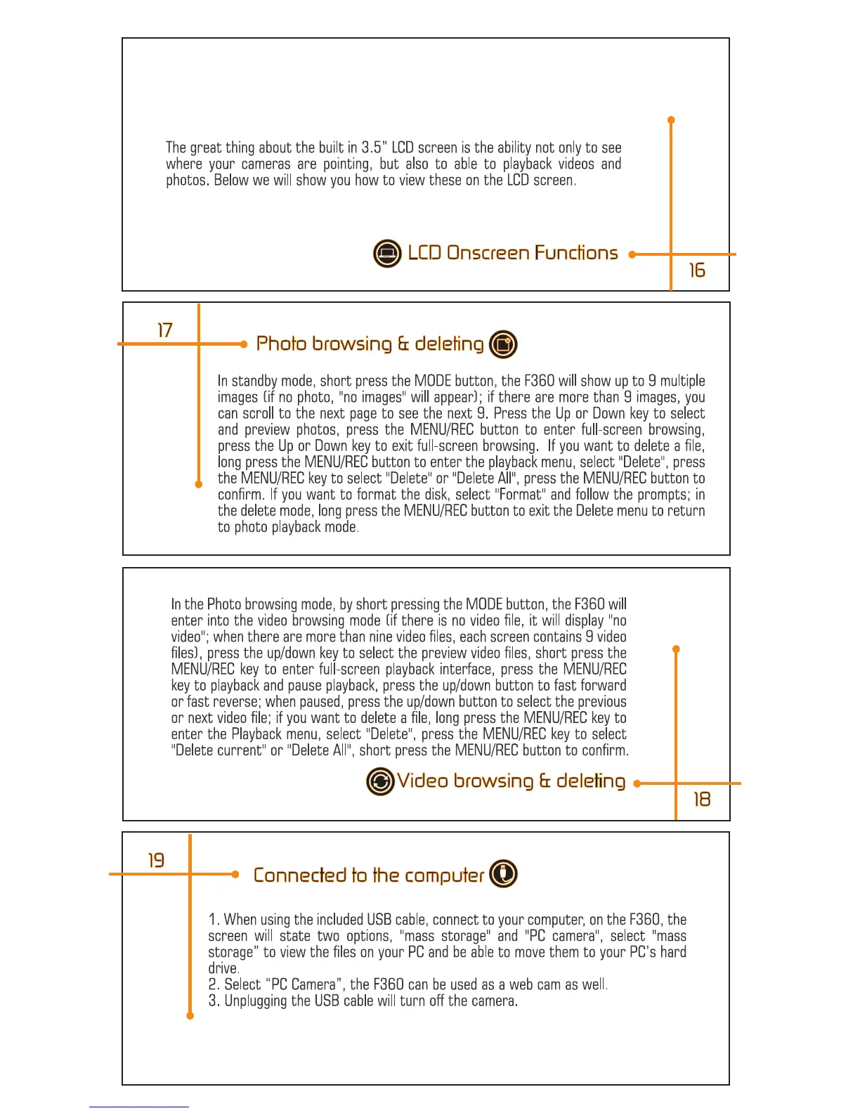 Falcon Zero F360 - LCD Onscreen Functions; Playback and Viewing; Media Management; Photo and Video Browsing;Deleting