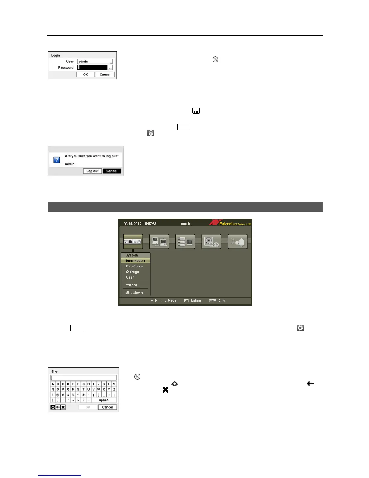 NOTE: To log the user out of the system, press the Menu button on the front panel or move the mouse pointer