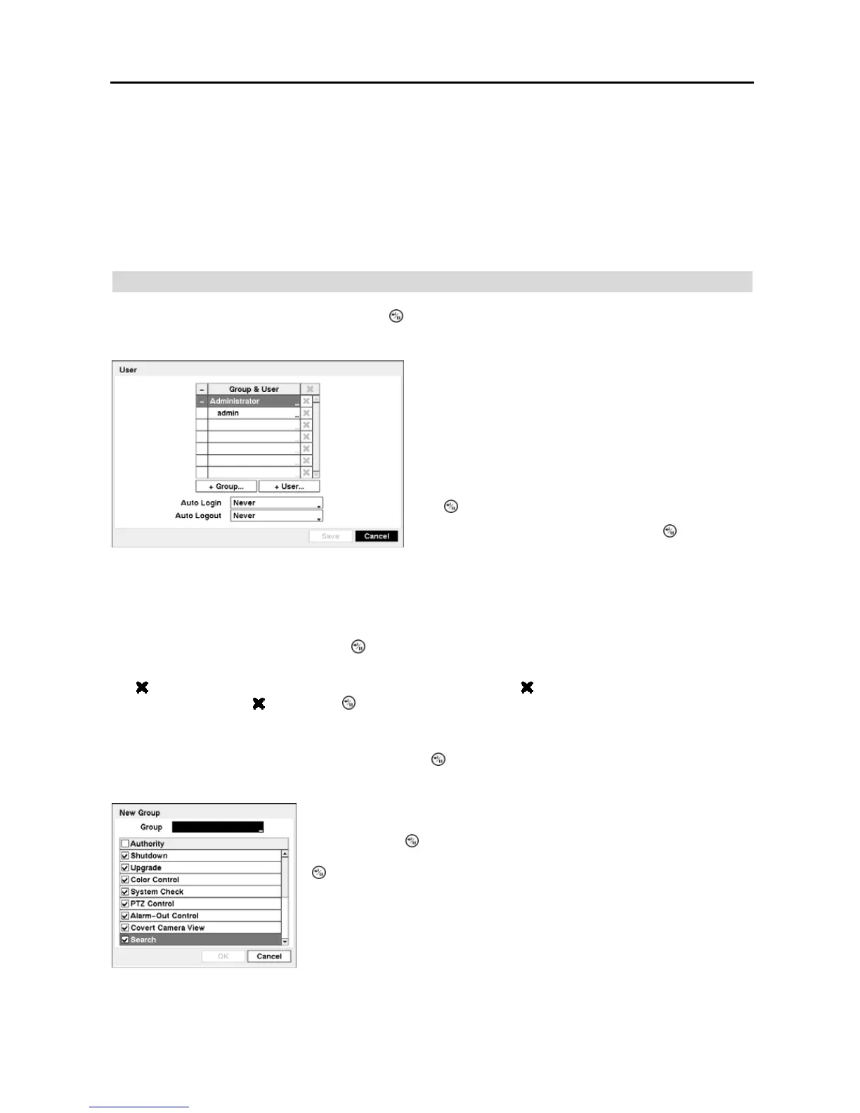 and users. You can add and delete groups and users. When adding a group, you can assign authority levels to the group.