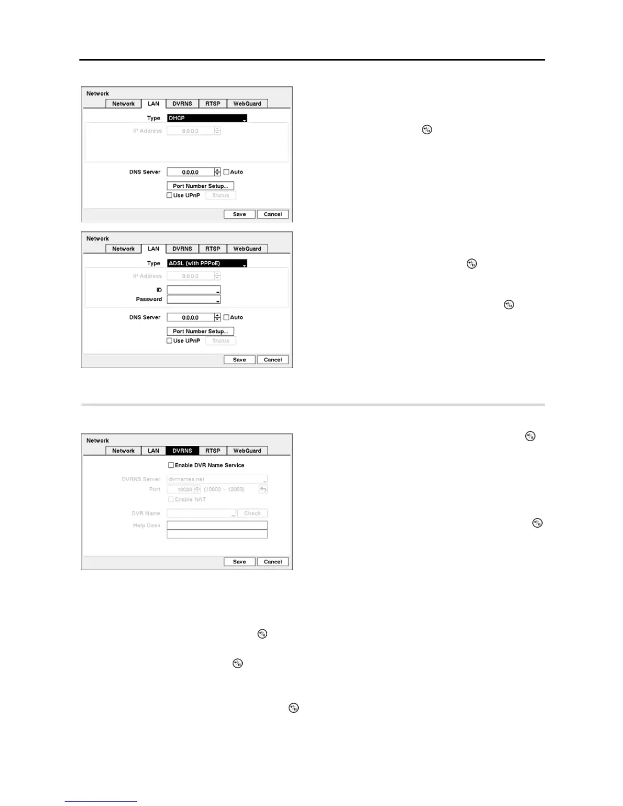 Highlight the box beside Port and press the button. Set the port number of the DVRNS server using the Up and