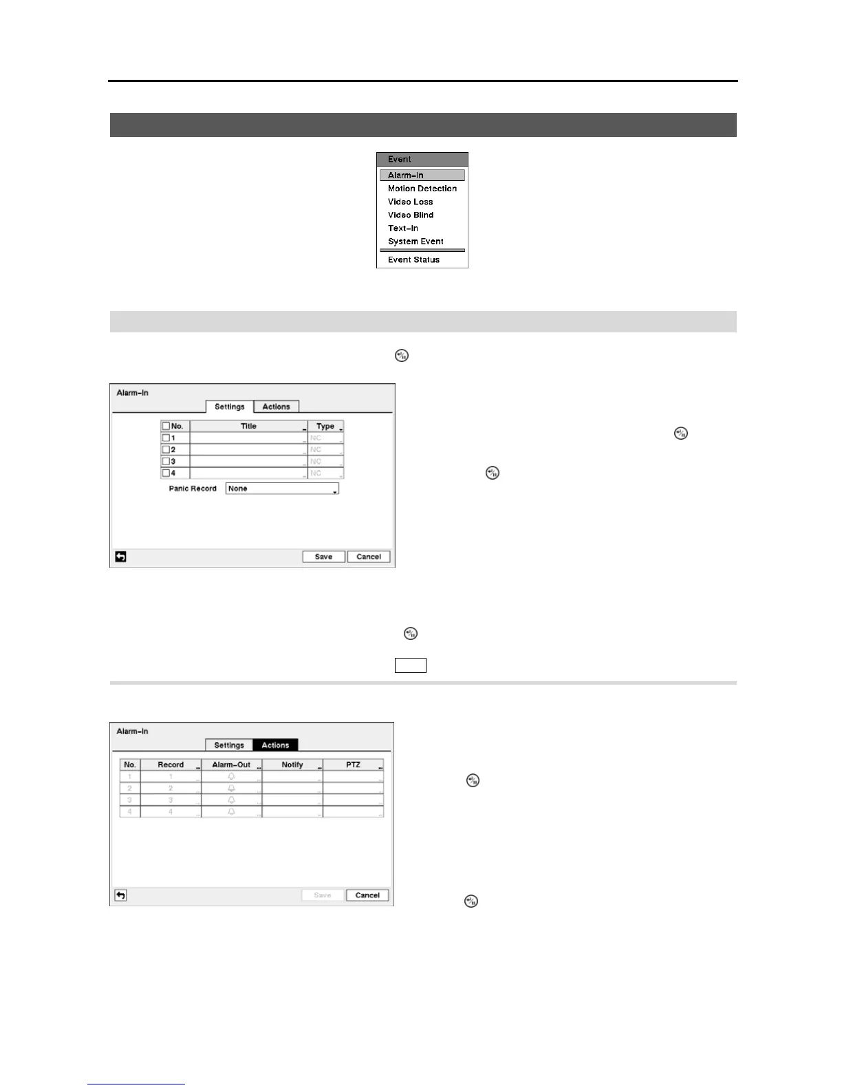 Highlight the Actions tab, and the Alarm-In Actions setup screen appears.
