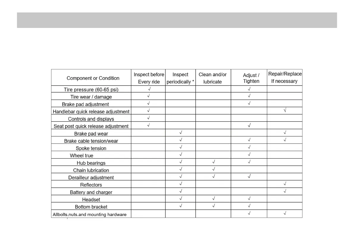 For your safety and enjoyment and to insure a long life for your E-Bike,inspect and maintain your E-Bike regularly.Use