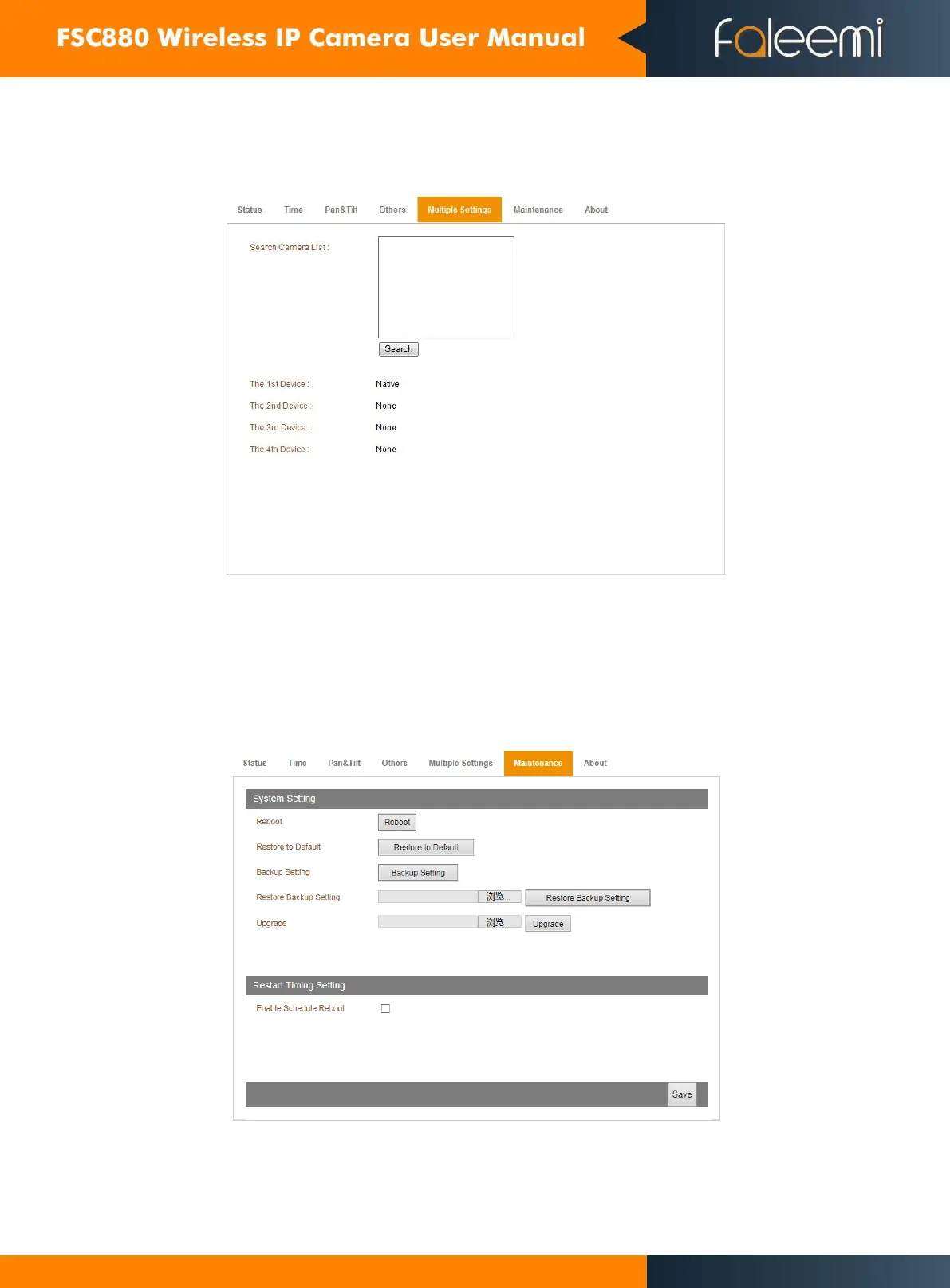 setting, restore backup setting, upgrade camera and timing reboot etc.