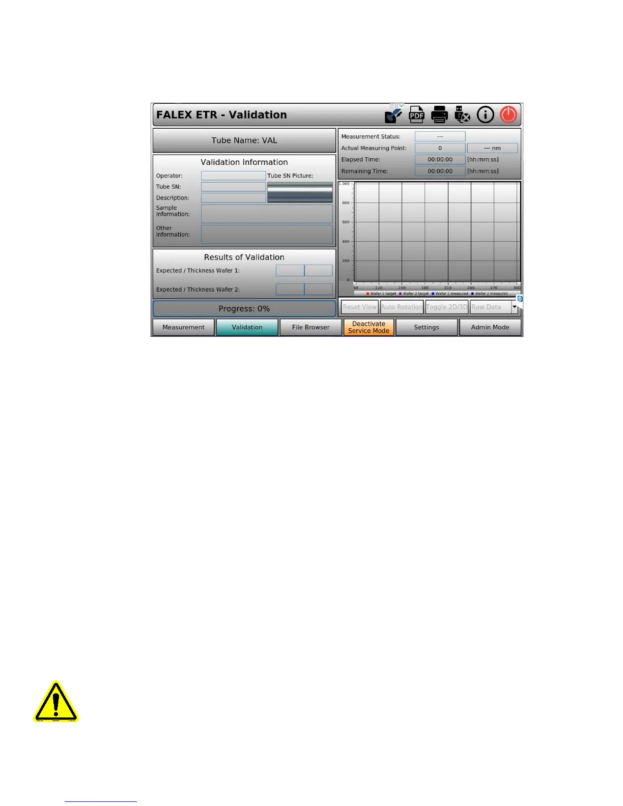 The ‘Validation’ display (figure 3-6) is used to verify if the machine is measuring the tube