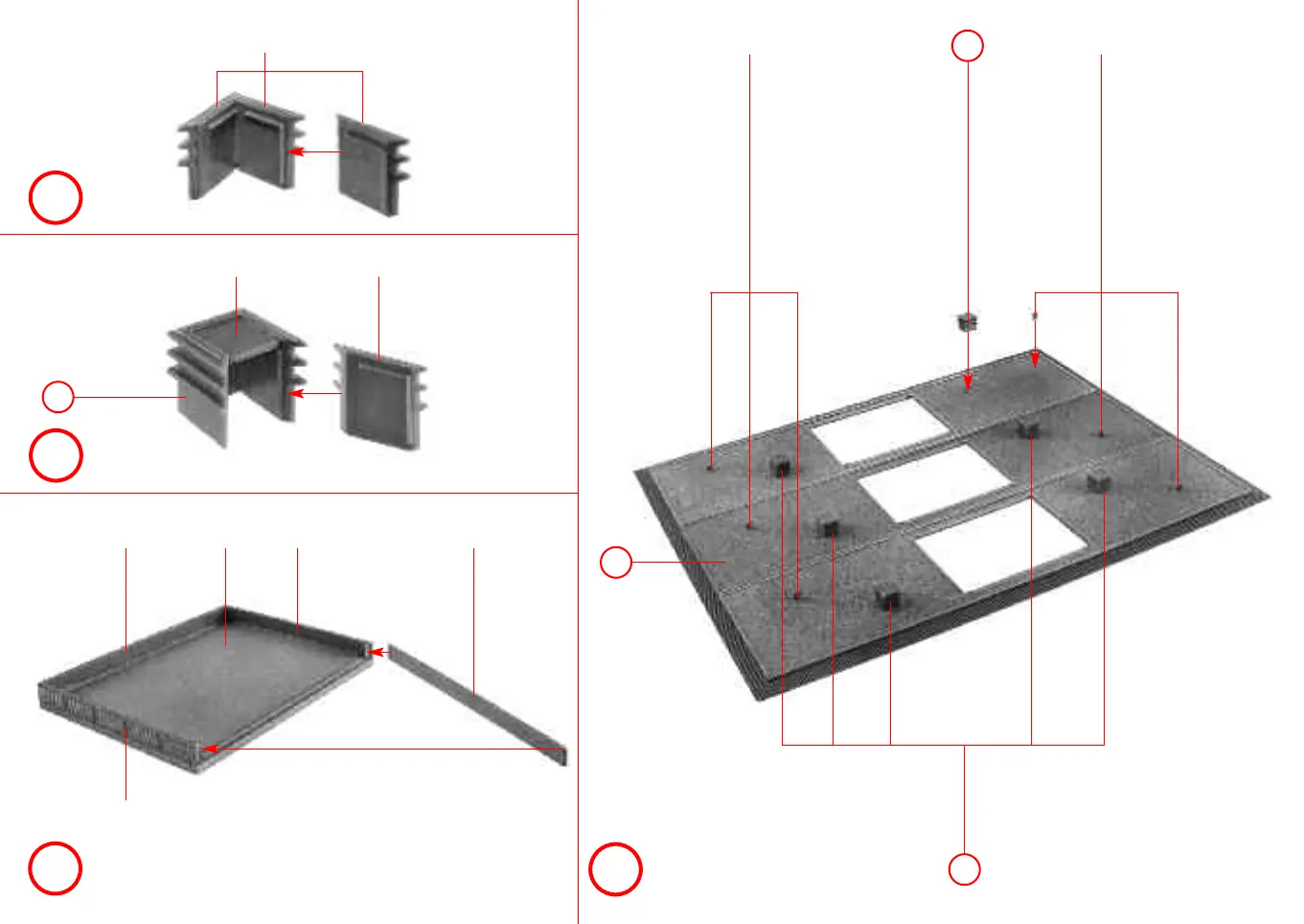 Faller 120217 - Base and Detail Components; Assemble Corner Pieces d (6 x); Assemble Support Pieces e (6 x); Assemble Base Tray f (3 x)