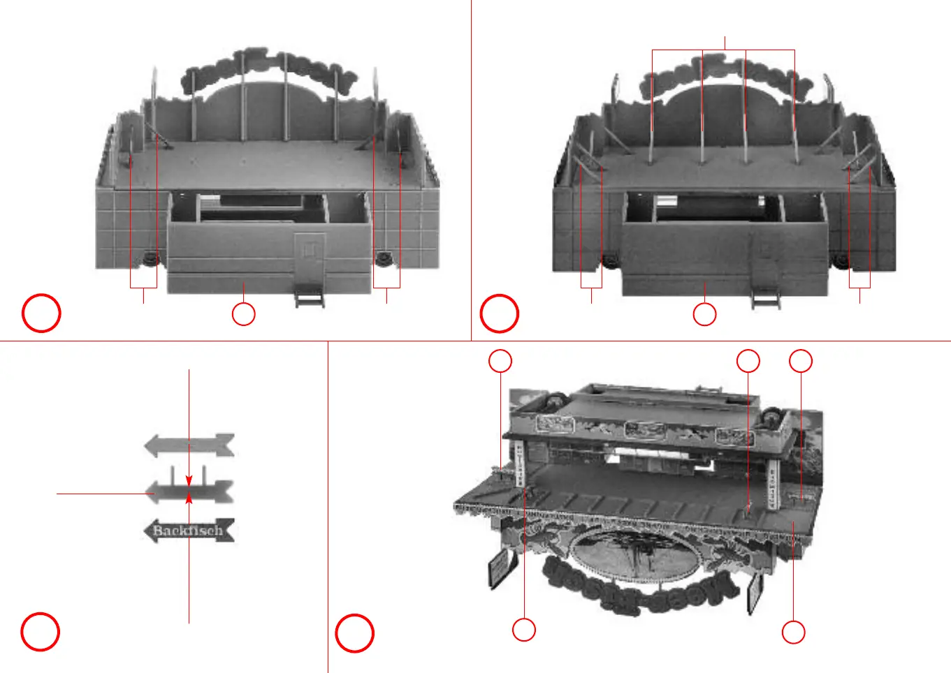 Faller 140445 - Assembly Step y;z: Upper Structure Details; Assembly Step A: Decorative Banners; Assembly Step B: Final Model View