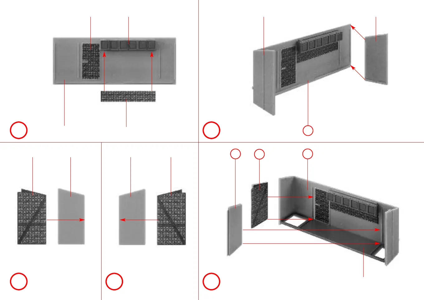 Faller 140445 - Model Assembly Steps; Assembly Step A: Base Structure; Assembly Step B: Side Panels; Assembly Step C: Left Side Detail